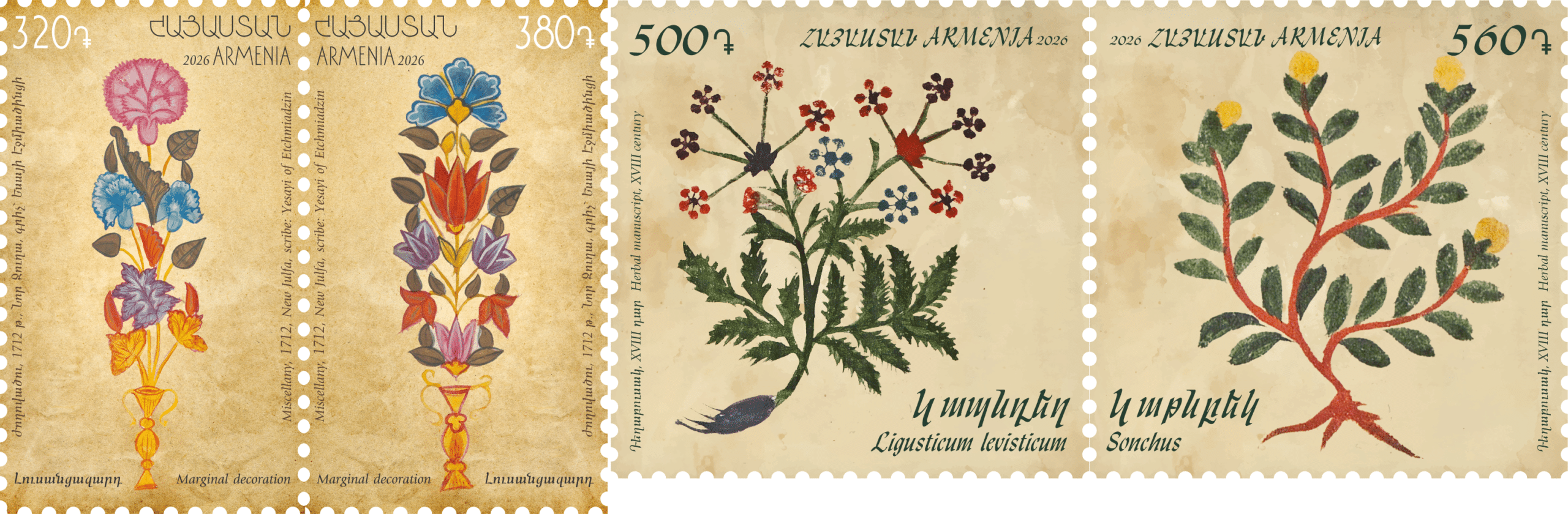 Le 28 avril 2026, quatre timbres consacrés au thème « Patrimoine arménien : L’art miniature arménien » furent mis en circulation par HayPost, la poste arménienne.