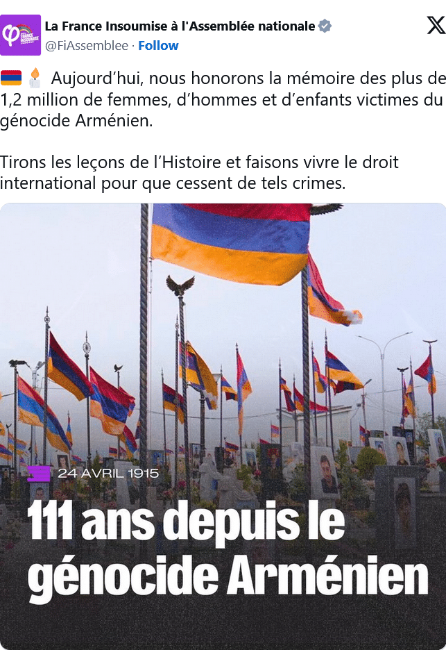 🇦🇲🕯️ Aujourd’hui, nous honorons la mémoire des plus de 1,2 million de femmes, d’hommes et d’enfants victimes du génocide Arménien.